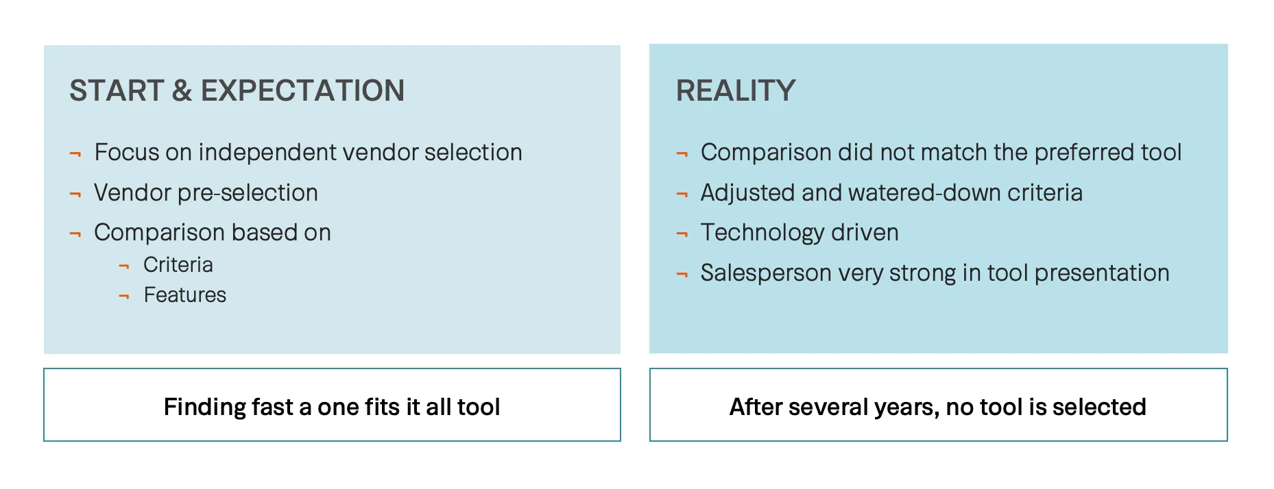 Aus meiner Sicht war hier im ersten Fall der Fehler, dass sich Team A im Auswahlprozess nicht mehr auf die Kriterien und Funktionen konzentriert hat, sondern von Emotionen und einigen Fancy Features getrieben die Entscheidung für eine Automatisierungslösung getroffen hat.