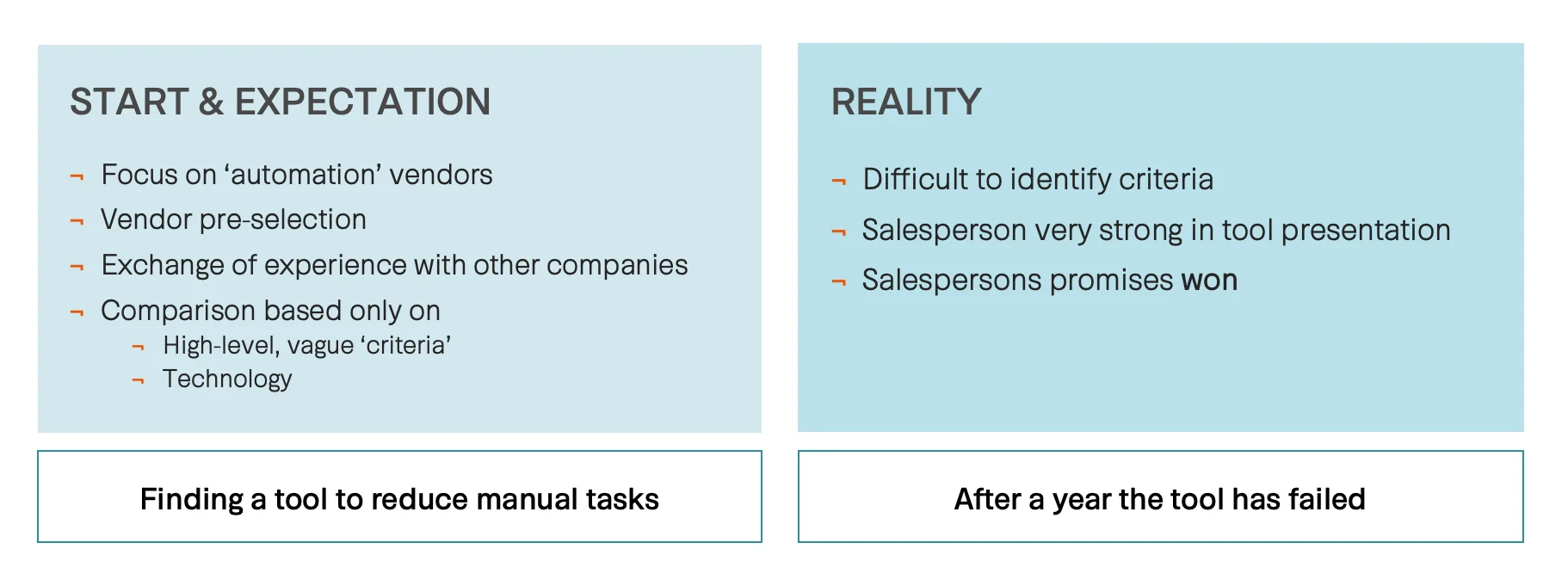 Der Wunsch nach einem umfassenden Automatisierungsprodukt entsteht dann meist sehr schnell. Mittlerweile gibt es viele Produkte auf dem Markt: Etablierte, Newcomer und Eigenentwicklungen. Die Projektteams haben die Qual der Wahl. Und erleben nicht selten nach der Produktauswahl oder Produkteinführung eine Enttäuschung.