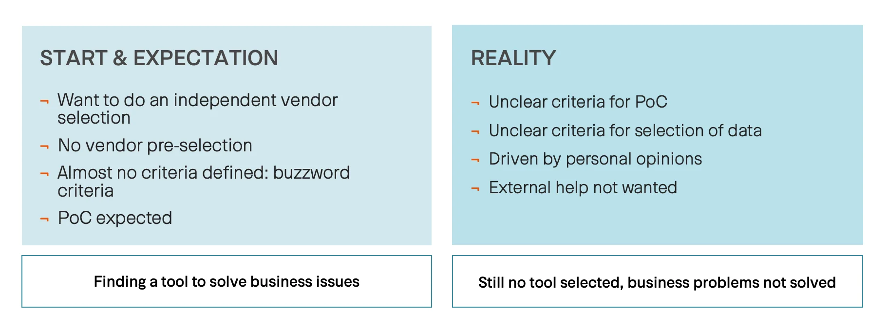Zu diesem Zeitpunkt schien es, dass Team B wirklich auf dem besten Weg war, ein perfektes Werkzeug für ihre Anforderungen und Ziele zu identifizieren. Aber: Team B formulierte die Anforderungen auf einem sehr hohen und abstrakten Niveau, mit einer vagen Definition und einem sehr starken Fokus auf Technologie. Und darüber hinaus hat es von diesem Zeitpunkt an auf externe Unterstützung verzichtet.