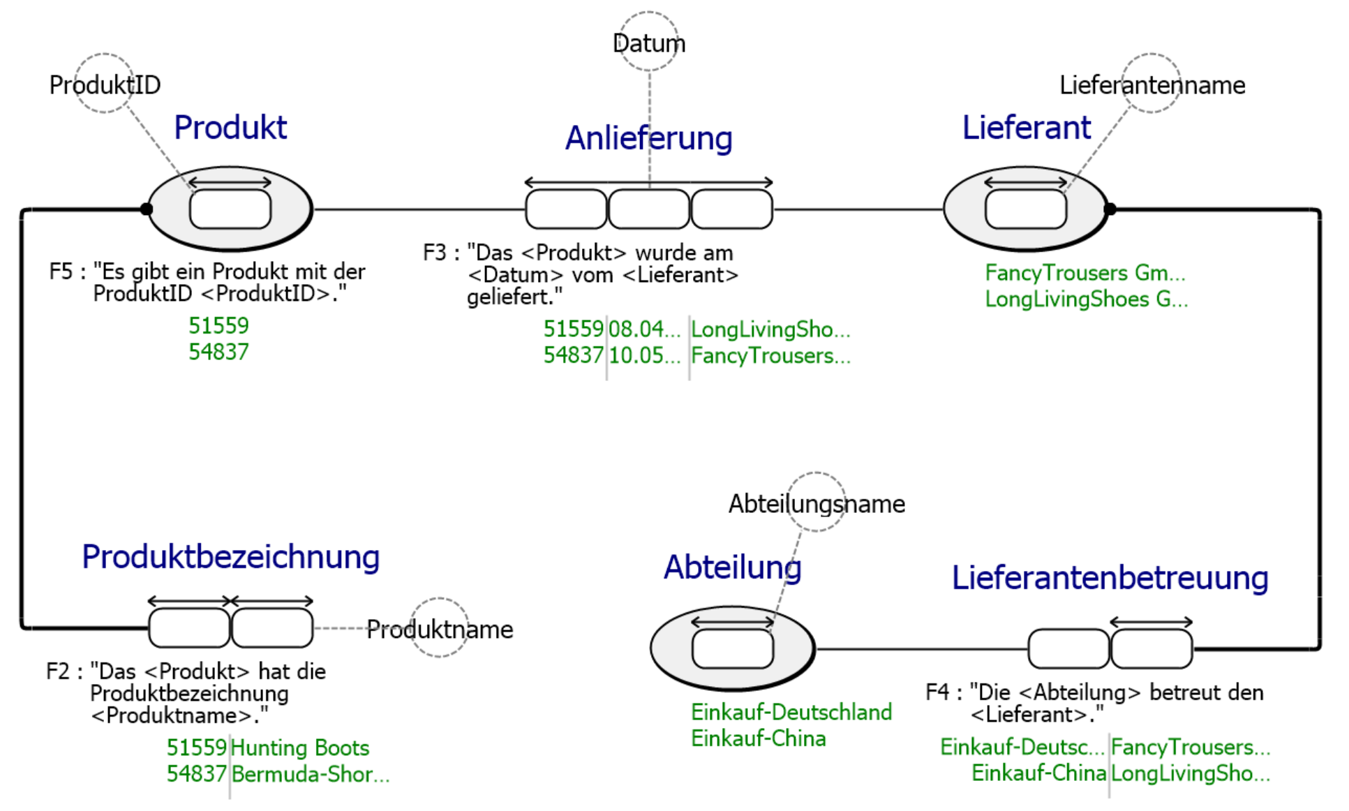 Durch die Nutzung konkreter Beispiele wird die Bedeutung der modellierten Informationen deutlich klarer als bei generellen Beschreibungen [ZEH15]. Die Faktenbeispiele dienen ebenso als Basis zur Kommunikation zwischen Modellierer und Domänenexperte wie auch zur Entscheidungshilfe bei der Definition von Identifikatoren oder Nebenbedingungen (Constraints). Dieses Merkmal gibt der Methodenfamilie den Namen fact-oriented.